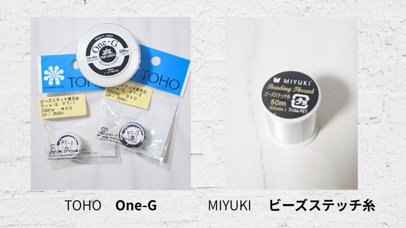 初心者におススメな糸はTOHOが出している「One-G」と、MIYUKIが出している「ビーズステッチ糸」。いずれもナイロン糸です。