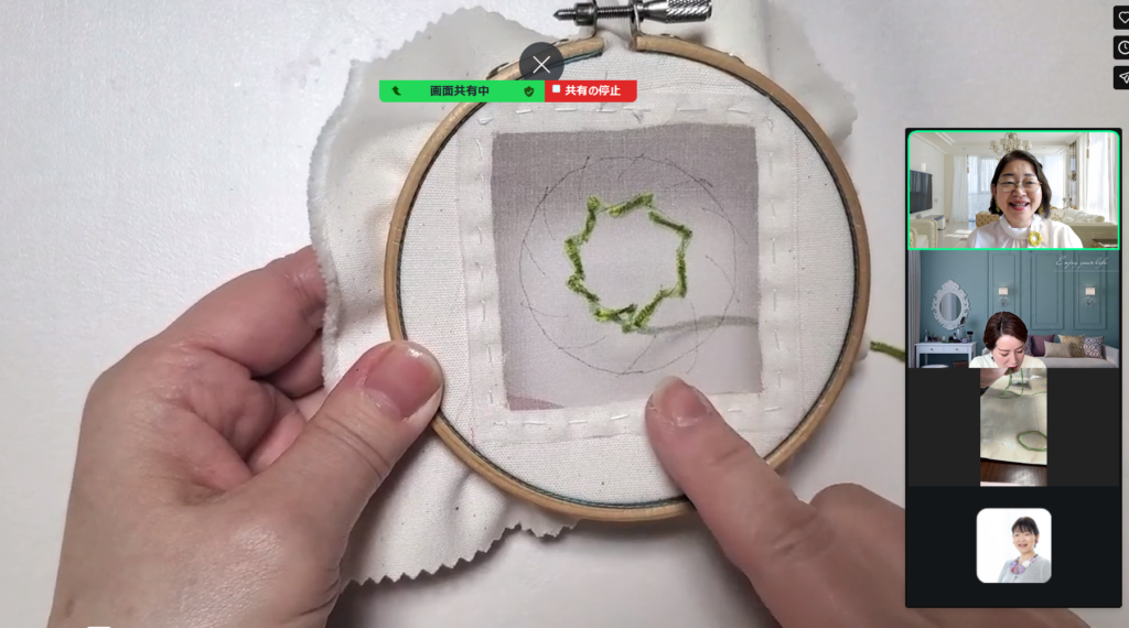 刺繍中はカメラ下での作業は難しいので、ステップごとにお手元を見せていただきながら、進行状況を確認しつつ進めていきました。