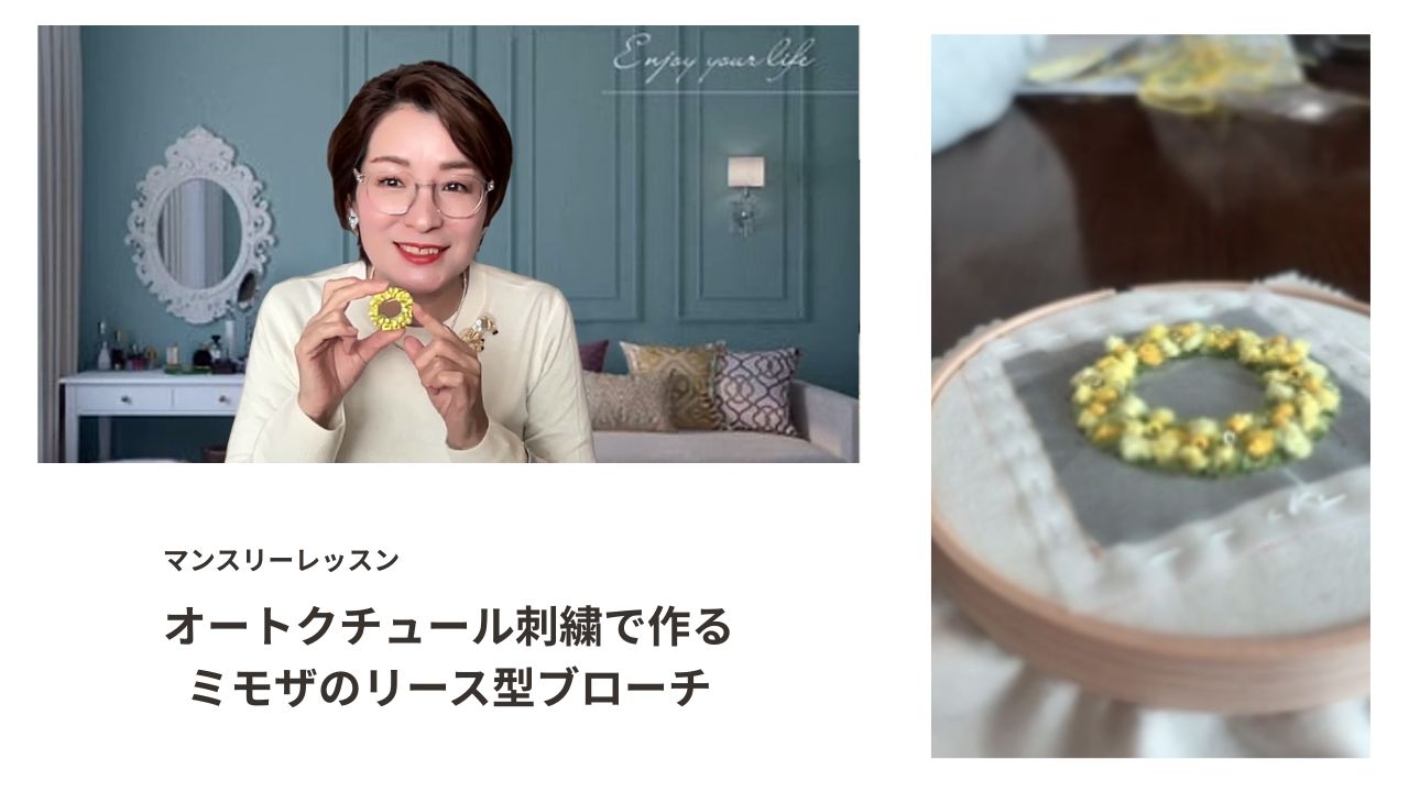 オートクチュール刺繍で作るミモザのリース型ブローチのマンスリーレッスン。